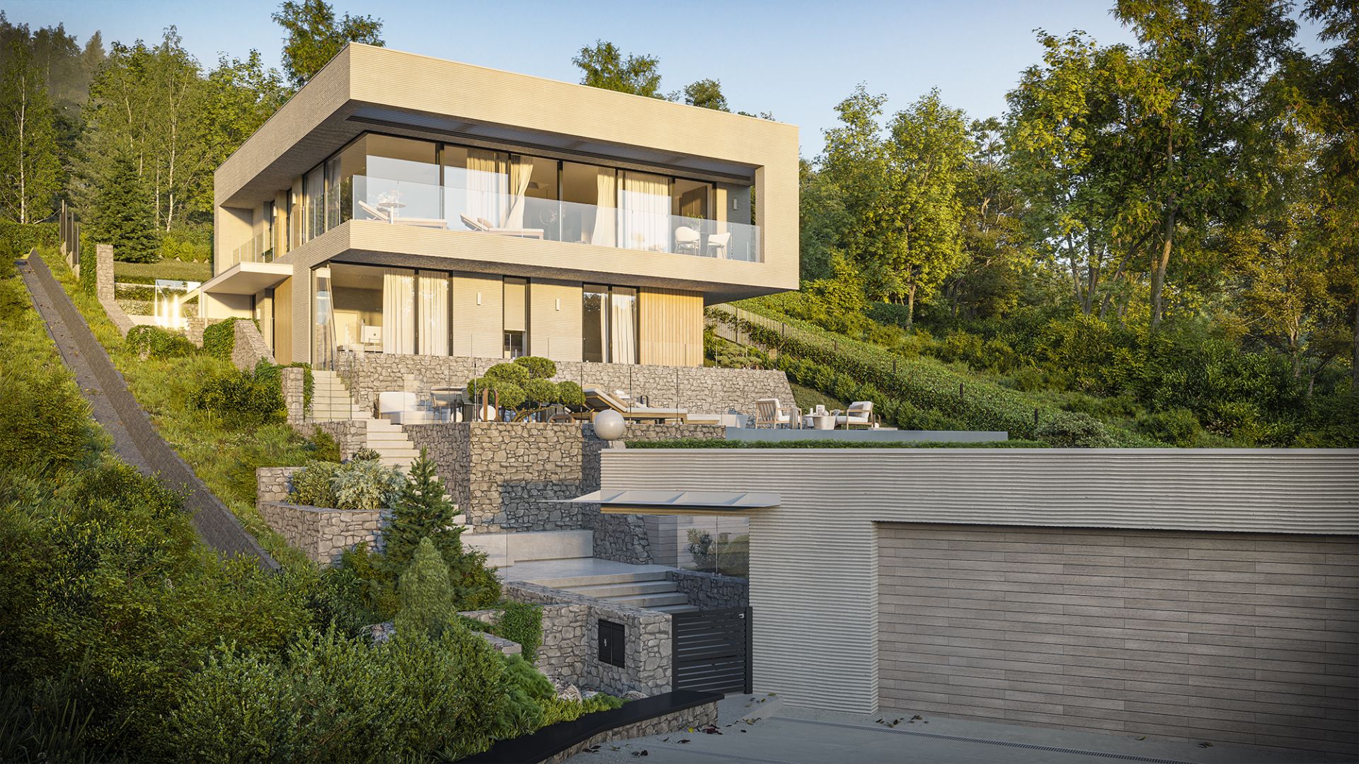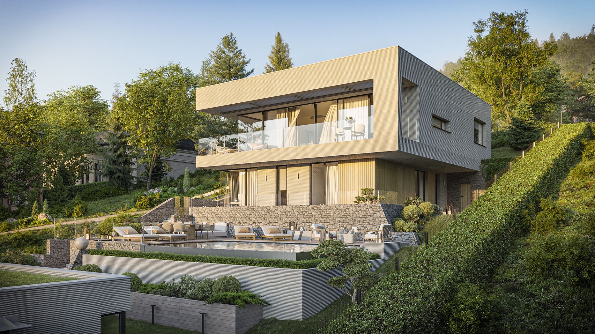Die Entstehung dieser Villa bedeutete weit mehr als die Bebauung eines Grundstücks. Das Ziel war nicht, dass sich das Gebäude an die Landschaft anpasst – sondern dass es mit ihr atmet. Die gestufte, dem Hang folgende Kubatur fügt sich in den Berghang, als hätte sie immer schon dort gestanden. Die Funktionen sind nicht getrennt, sondern fließen organisch ineinander – im Rhythmus des Geländes.