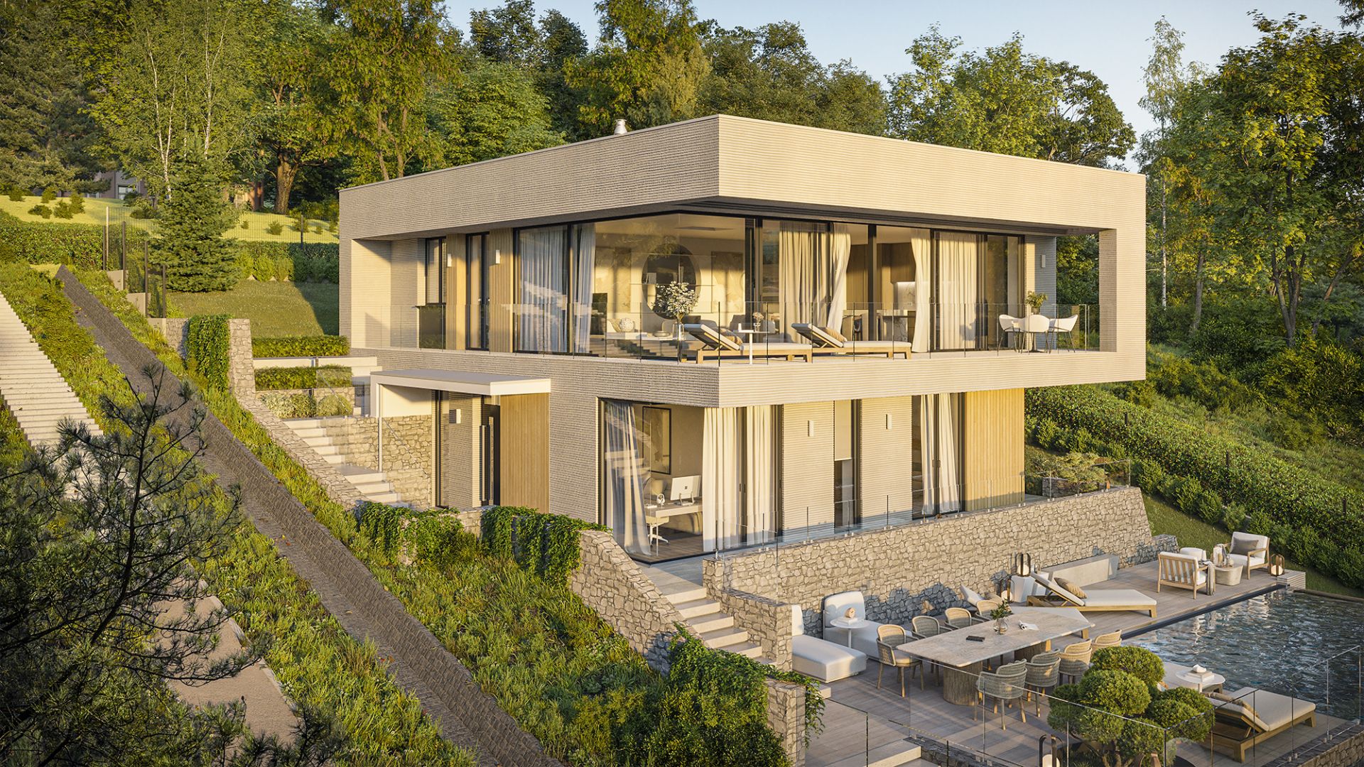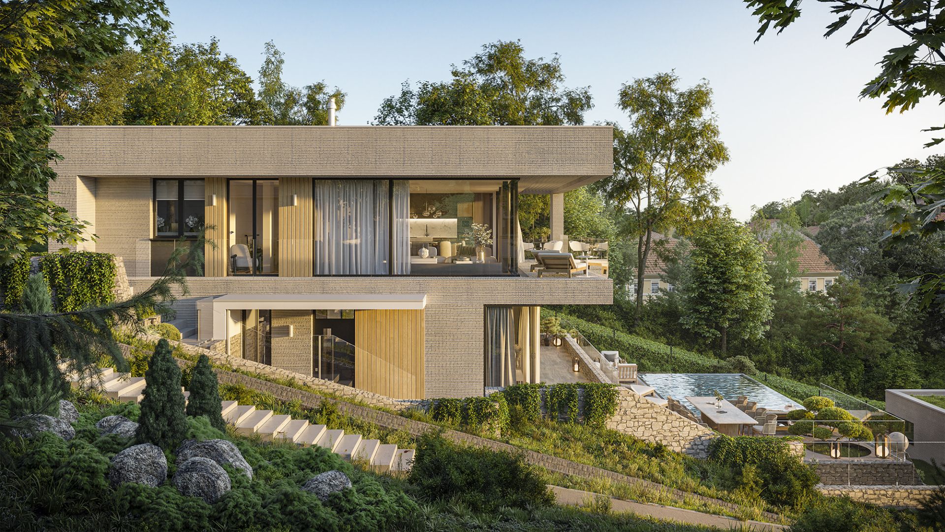 Naturstein, Holz und feine horizontale Gliederungen sind hier keine Dekoration, sondern Identität. Diese Materialien schaffen Beständigkeit, Textur und warme Eleganz – in einem zeitgenössischen architektonischen Verhältnis. Die großzügigen Glasflächen bieten nicht nur Ausblick, sondern lassen die Grenze zwischen Innen- und Außenraum nahezu verschwinden.